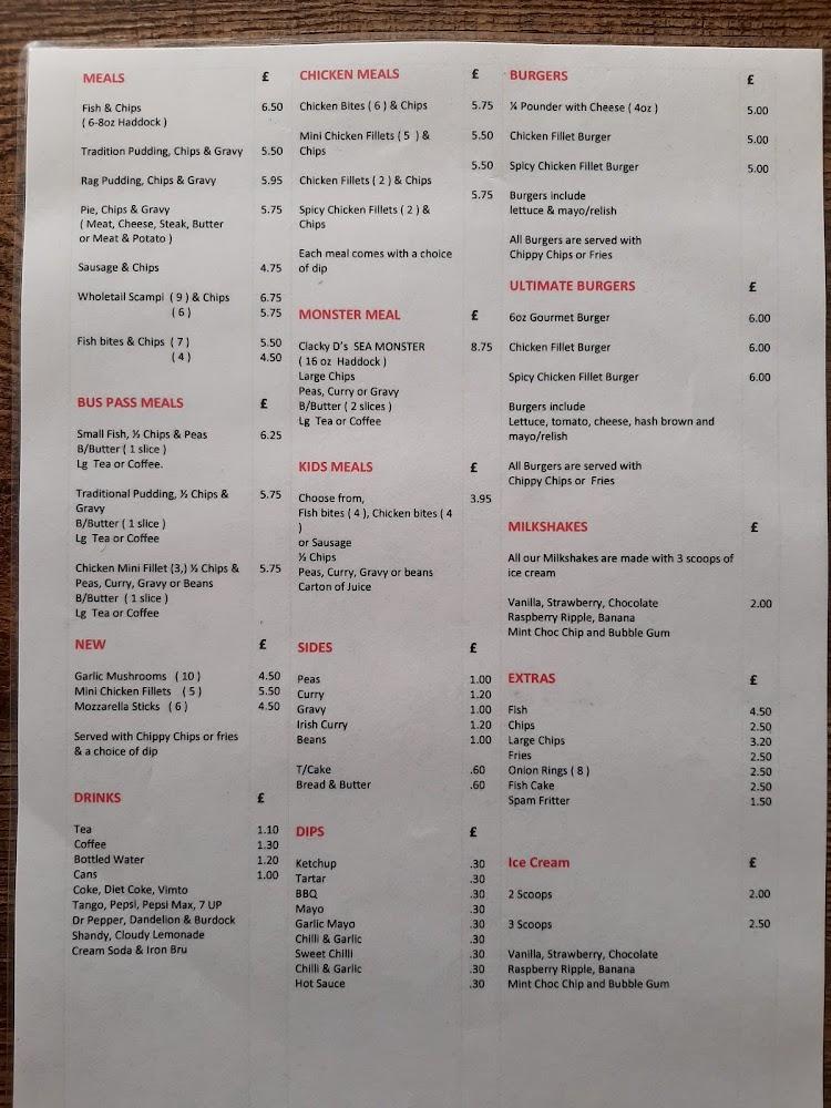 Located at 7-9 Clayton St, Great Harwood, Blackburn, Clayton Street Chippy is a beloved staple in the community. A proud establishment for 90 years, it combines tradition with local charm. The casual vibe invites a diverse crowd, including families and groups, fostering a sense of community. Accessibility is prioritized with a wheelchair-accessible entrance and seating, making it inclusive for everyone. Known for its friendly staff, Clacky D's creates a warm and inviting experience. The emphasis on quick service means you won't wait long to enjoy your meal, whether you choose to dine-in or take away. Plus, with a great selection of tea available, it's easy to see why this chippy has garnered a loyal clientele over the decades.